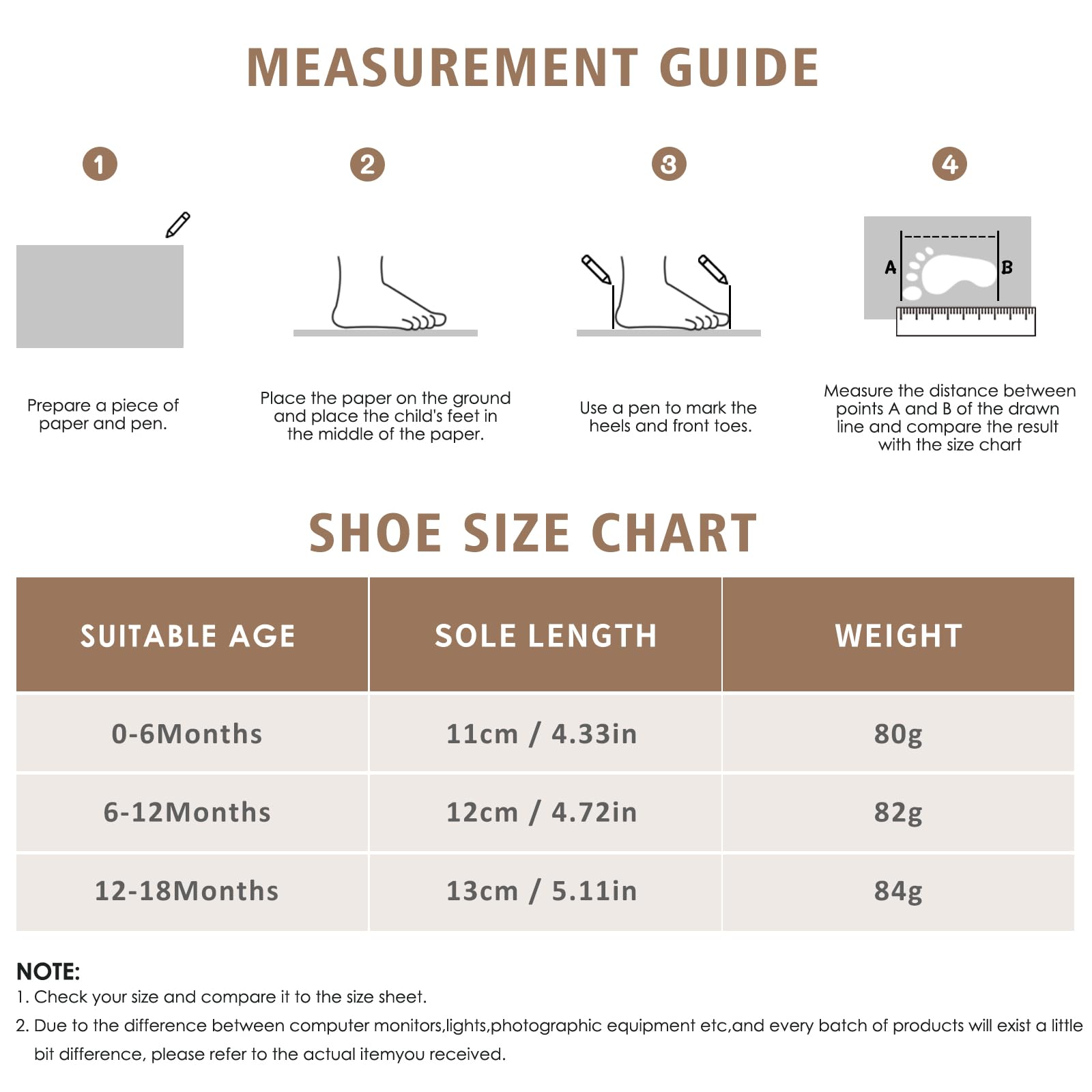 - Guide to size: these thermal shoes are suitable for newborn babies from 0-18 months. The age is for guidance only. We recommend measuring your baby's feet and consult our size chart to find the best possible fit.