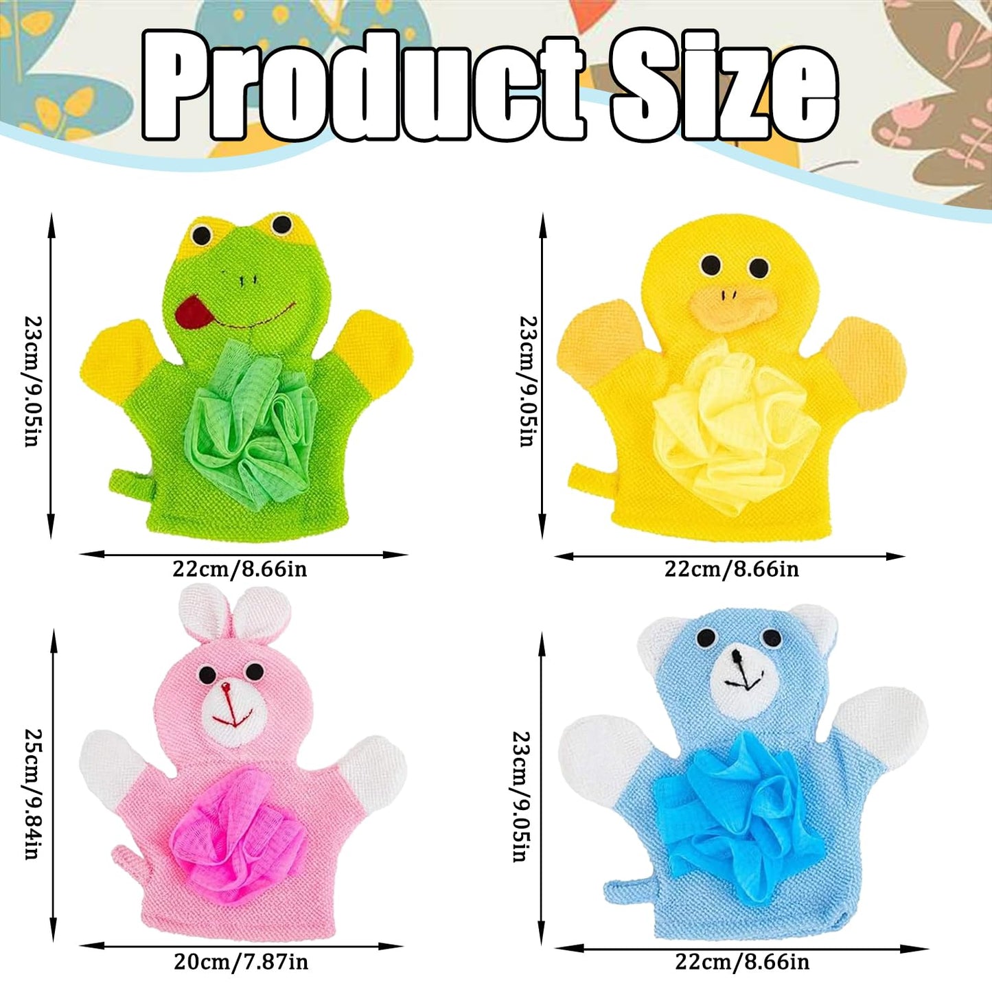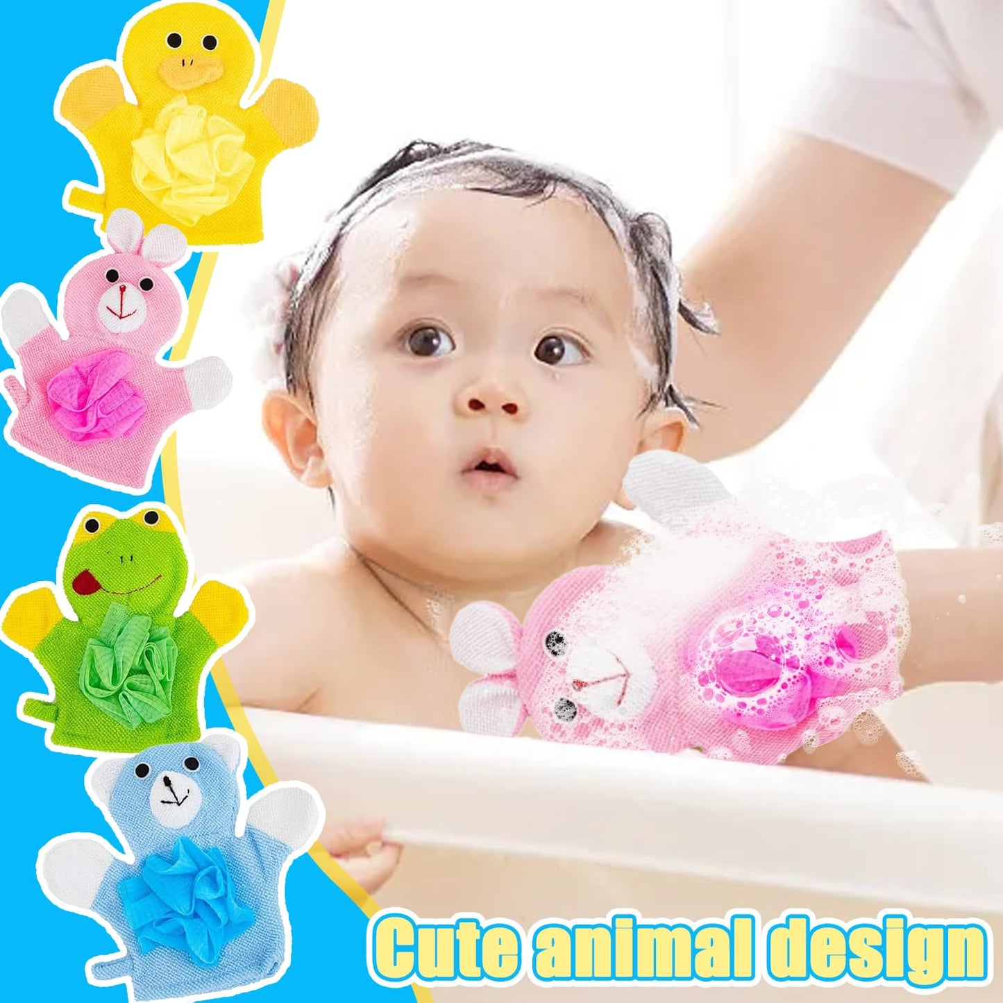 • Package includes: you will receive 4 baby bath gloves in different styles, including green frog, blue bear, yellow duck and pink rabbit. The animal shape bath gloves can easily make children fall in love with bathing, and the cute animal shapes can easily give children the feeling that bathing is a game, and even encourage them to take a bath alone.